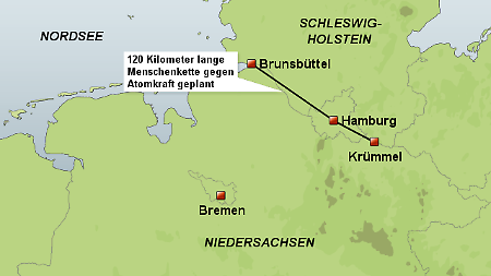 Die Veranstalter sprechen von einem vollen Erfolg: Es sei gelungen, eine mittlerweile 120 Kilometer lange Menschenkette vom Kernkraftwerk Brunsbüttel bis zum Meiler Krümmel in Geesthacht zu bilden.