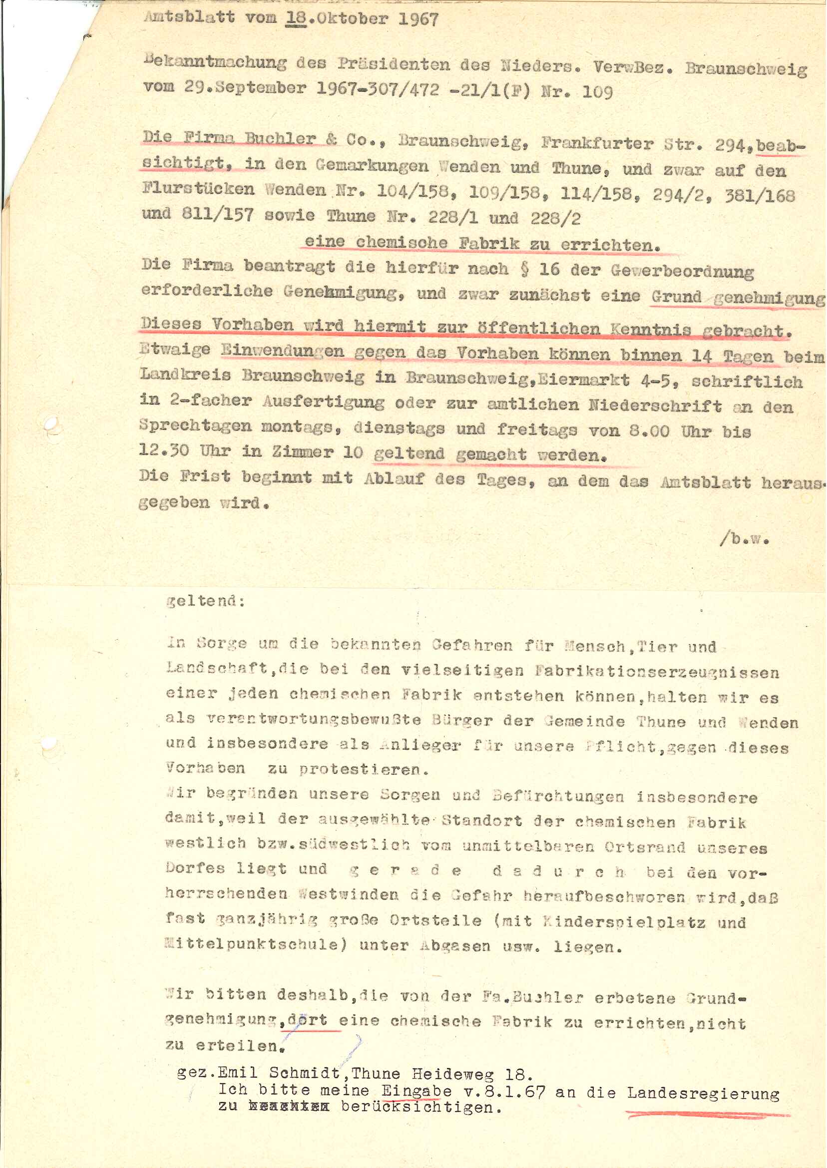 08.01.1967 Ein Thuner Bürger macht eine Eingabe an die niedersächsische Landesregierung und bittet, der Firma Buchler die Baugenehmigung einer chemischen Fabrik in BS-Wenden-Thune nicht zu erteilen. Bereits damals war man also in Sorge.